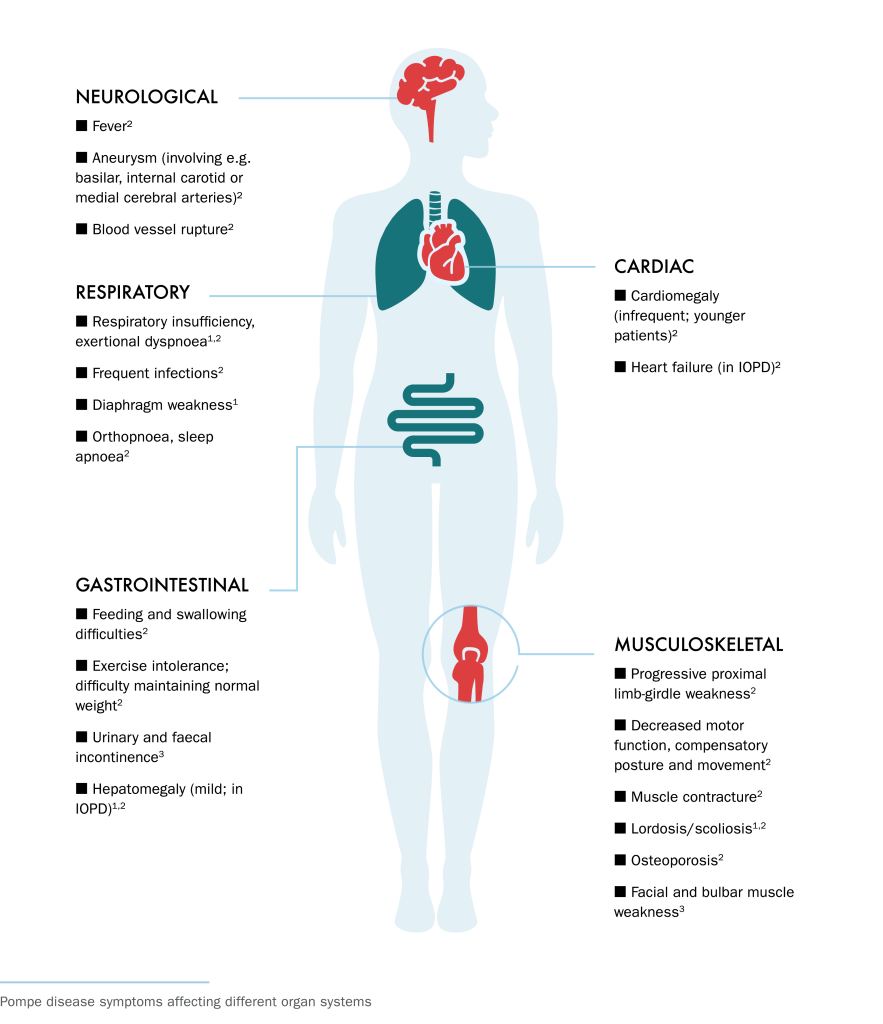 - Kishnani PS, et al. Late-Onset Pompe Disease: Presentation, Diagnosis and Management. A CME Monograph. American Association of Neuromuscular & Electrodiagnostic Medicine and MedLogix Communications, LLC.