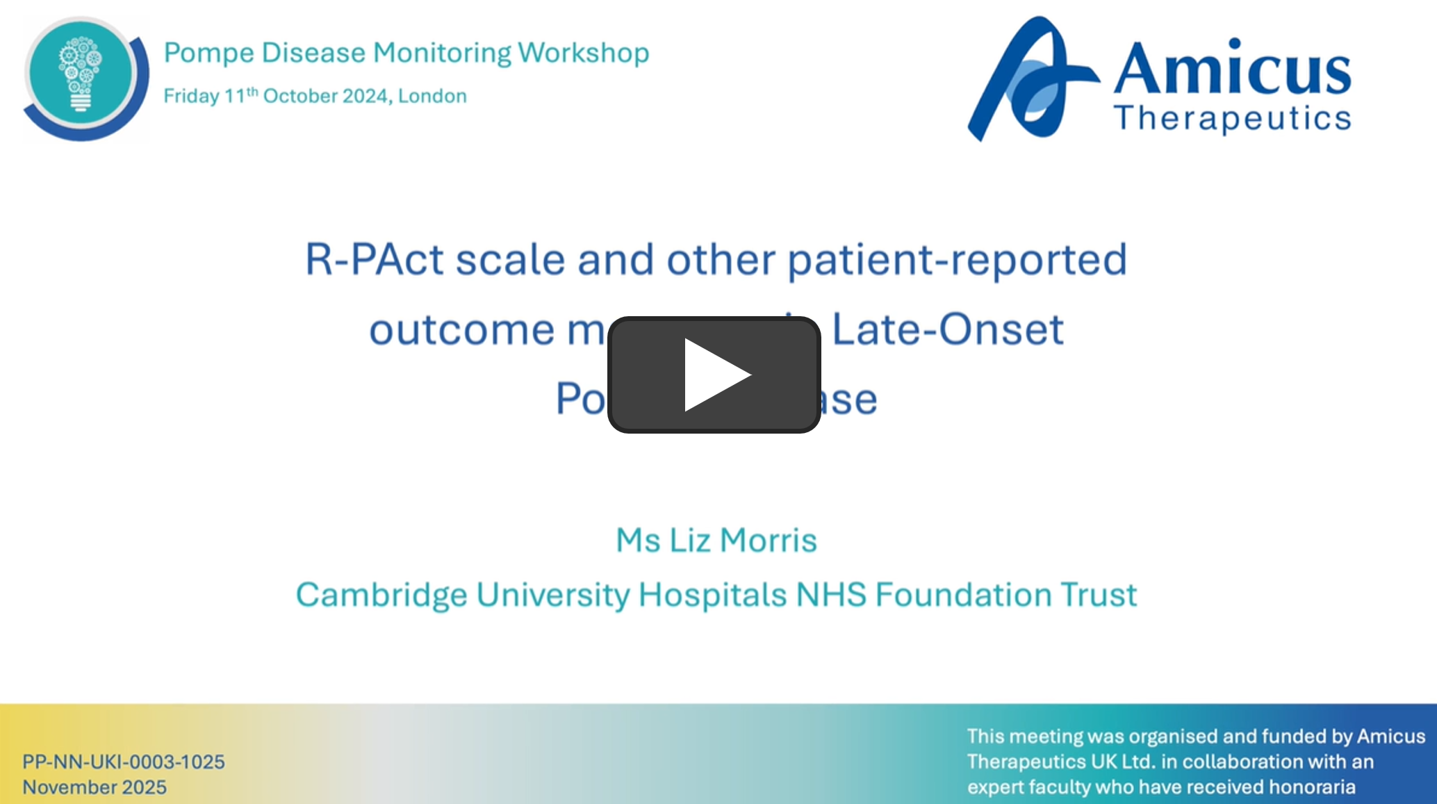 In this video, discover how patient-reported outcome (PRO) measures, including the R-Pact scale, can provide insight into the lived experience of people with late-onset Pompe disease (LOPD), helping healthcare professionals understand the impact of the disease on their daily lives.